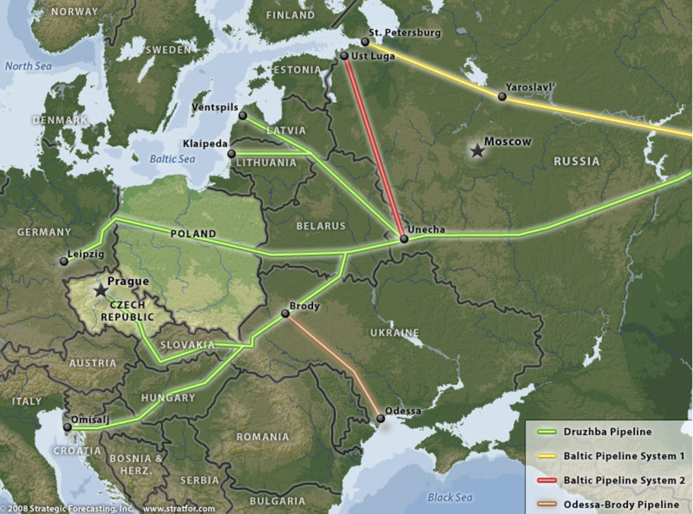 Source: Strategic Forecasting, Inc. (Stratfor). Green lines show the Druzhba pipeline; the Brody hub in Ukraine marks the southern branch’s main transit point.